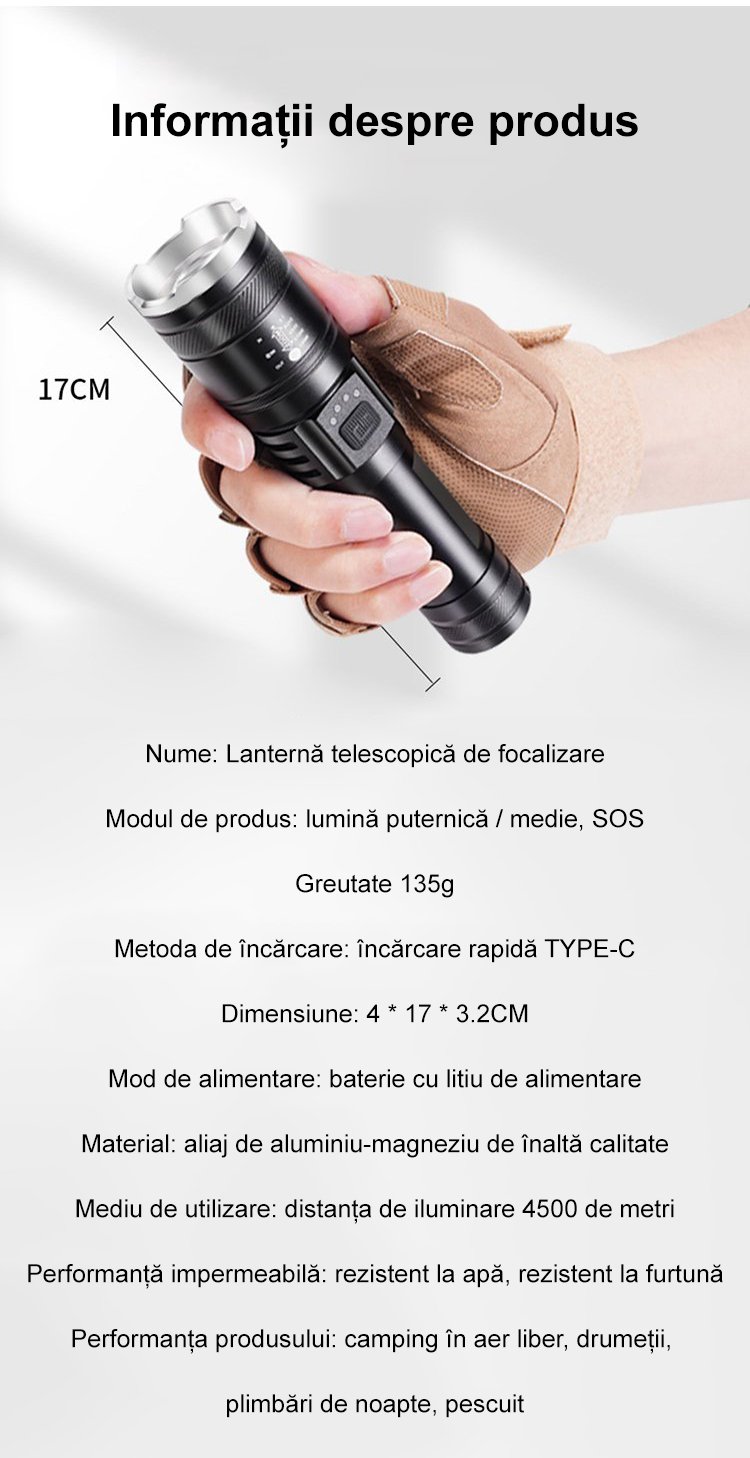 Lanterna cu LED-uri puternice, cu zoom, pentru uz exterior.